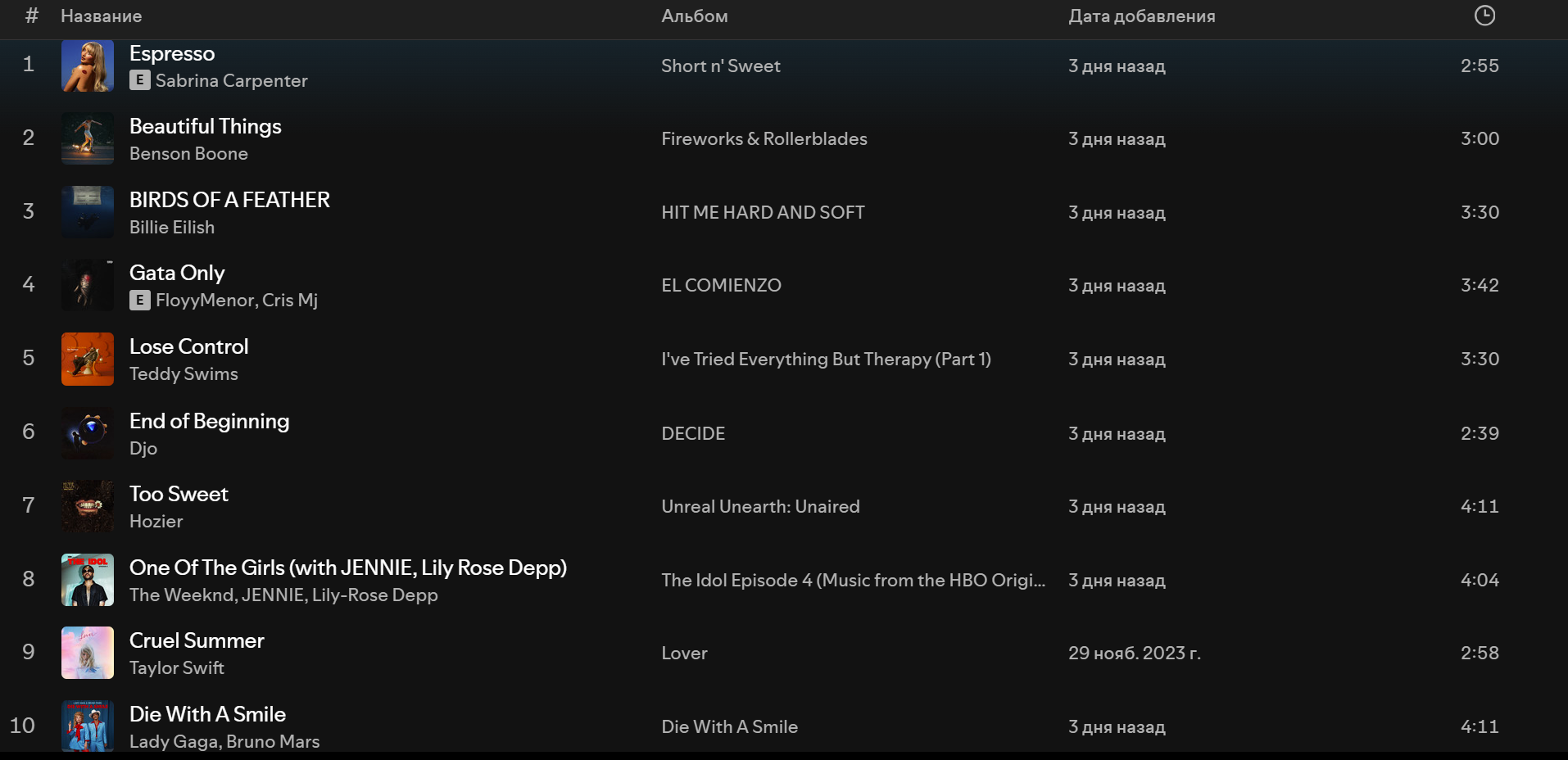 Що стосується списку треків, які найчастіше слухали у всьому світі, то до нього увійшли пісні таких виконавців, як Біллі Айліш, Сабріна Карпентер, Леді Гага, Гаррі Стайлз та інші. До першої десятки увійшли: