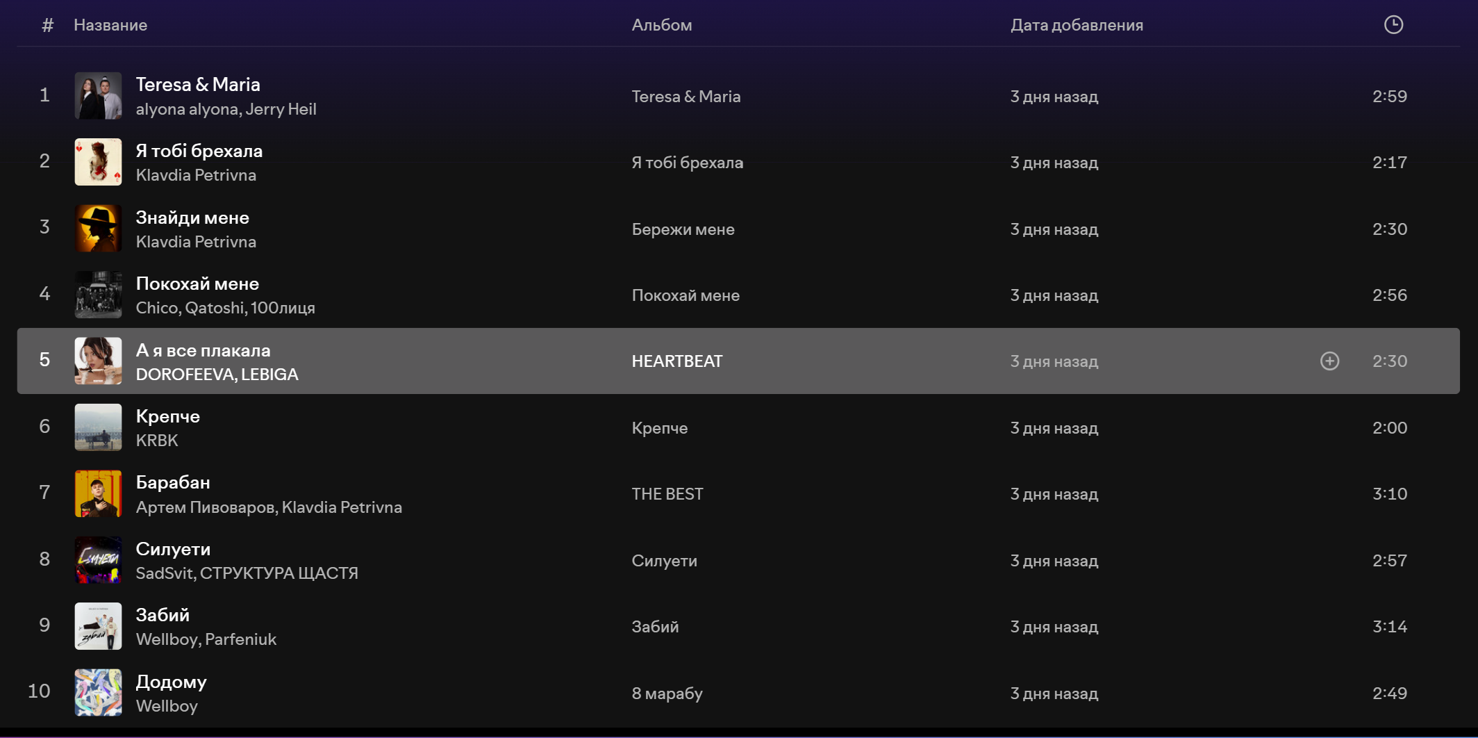 У списку найпопулярніших українських треків 49 – україномовні. Один трек у списку російськомовний – «Крепче» від виконавця KRBK. Перша десятка виглядає так: