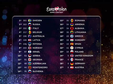 Представниця Росії Поліна Гагаріна з композицією A Million Voices посіла друге місце. Італія, Il Volo і їх Grande amore - треті.