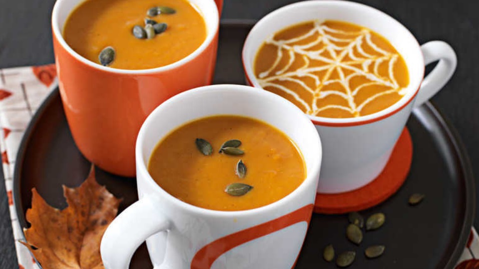 Щоб додати хелловінський дизайн у вигляді павутини, перекладіть крем-фреш в кондитерський мішечок з невеликою насадкою. Нанесіть спіраль на поверхню супу і кілька разів потягніть кінчиком ножа від центру спіралі до зовнішнього краю, щоб сформувати форму павутини.