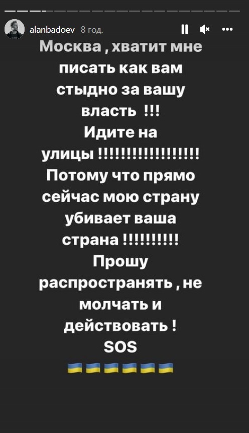 «Москва, досить мені писати, як вам соромно за вашу владу! Ідіть на вулиці! Тому що зараз мою країну вбиває ваша країна! Прошу поширювати, не мовчати і діяти!», — написав режисер у сторіс в Inatagram.
