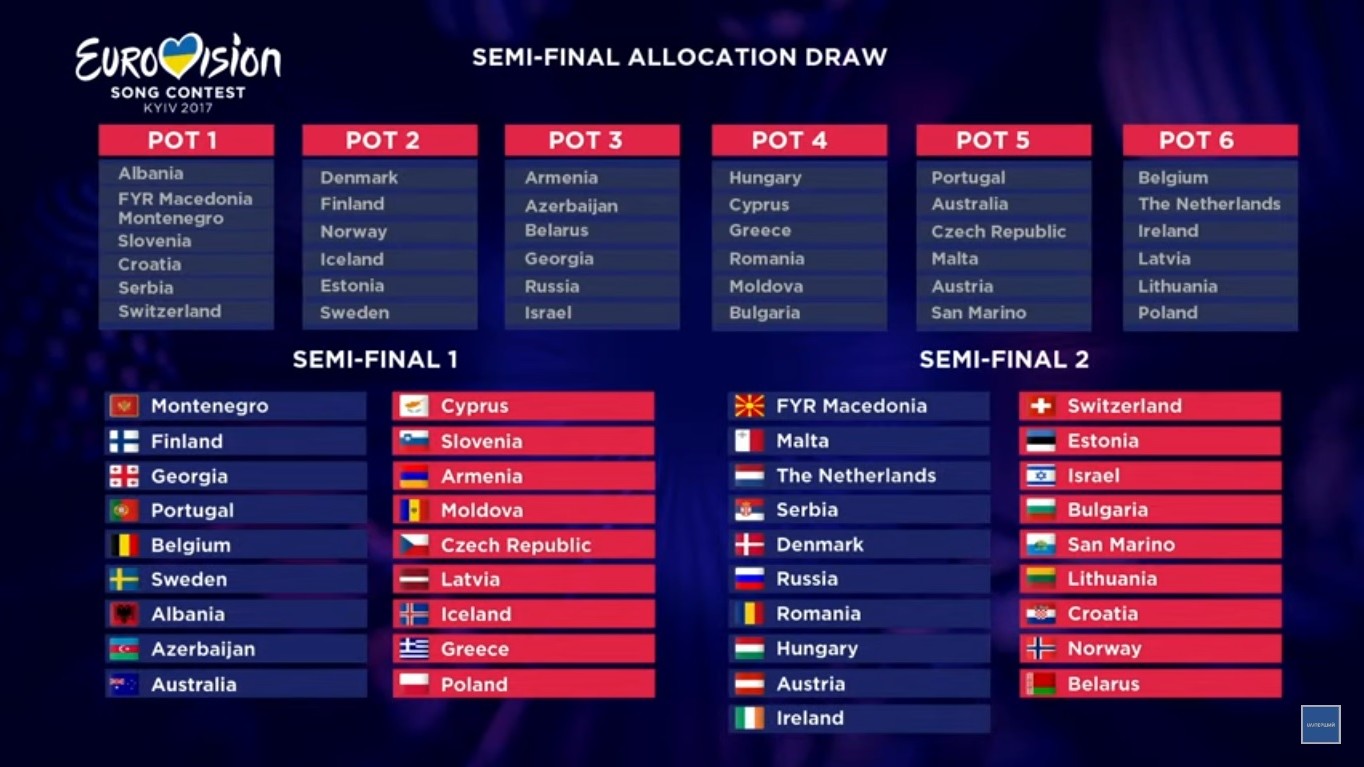 У ході жеребкування також була визначена частина півфіналу (перша або друга), в якій выстуят конкурсанти. Учасники першої половини півфіналу пофарбовані в синій колір, другої - в червоний. Точний порядок виступу представників країн-учасниць "Євробачення" буде визначений пізніше.