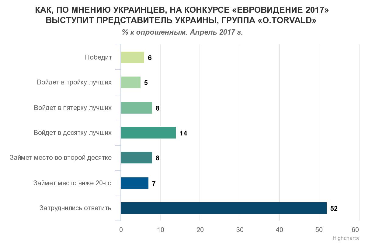 Більше половини українців (52%) не змогли спрогнозувати місце, яке O.Torvald зможе зайняти на цьогорічному конкурсі. Прогнози інших опитаних щодо результату виступу на цьогорічному конкурсі представника України розподілилися наступним чином: