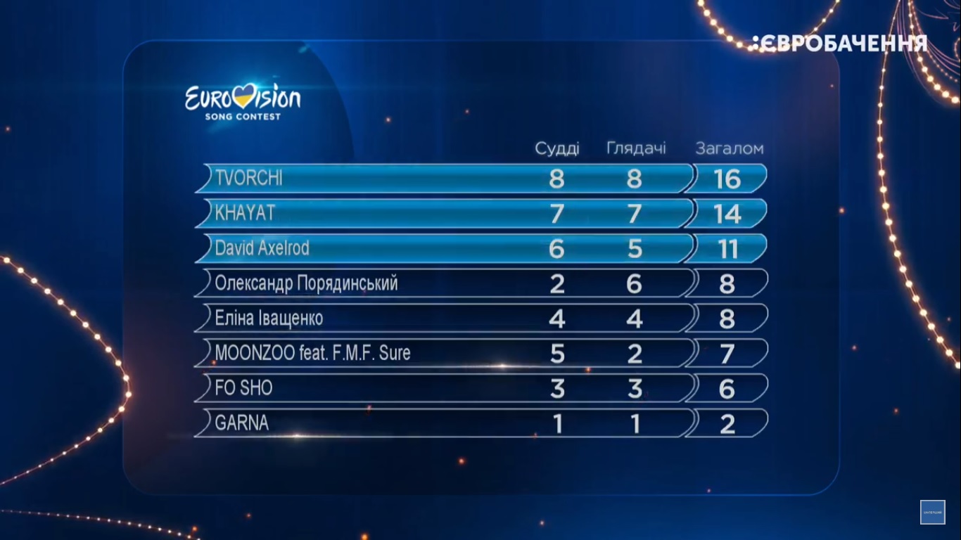 Найменшу кількість балів (1) і глядачі, і журі поставили співачці GARNA. Найвищу оцінку (8) і глядачі, і судді поставили гурту TVORCHI.
