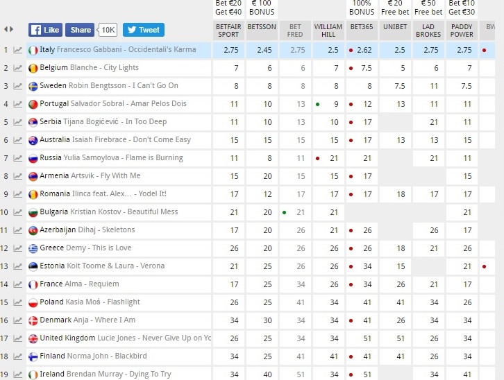 Друге місце букмекери пророкують Бельгії, а третє – Швеції. Виконавиця з Росії Юлія Самойлова може зайняти сьоме місце, а учасники від України, гурт O.Torvald - 27.