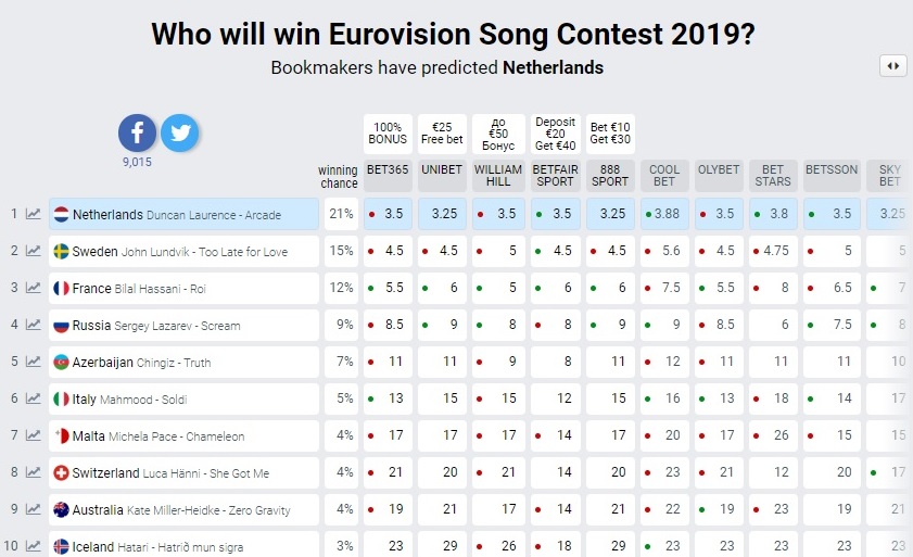 У вівторок, 14 травня, в Тель-Авіві відбудеться перший півфінал Міжнародного пісенного конкурсу "Євробачення-2019". Букмекери традиційно приймають ставки на переможця конкурсу. Як свідчать дані сайту Eurovisionworld.com, лідером все ще вважається представник Нідерландів Дункан Лоуренс, ймовірність його перемоги оцінюється в 21%.