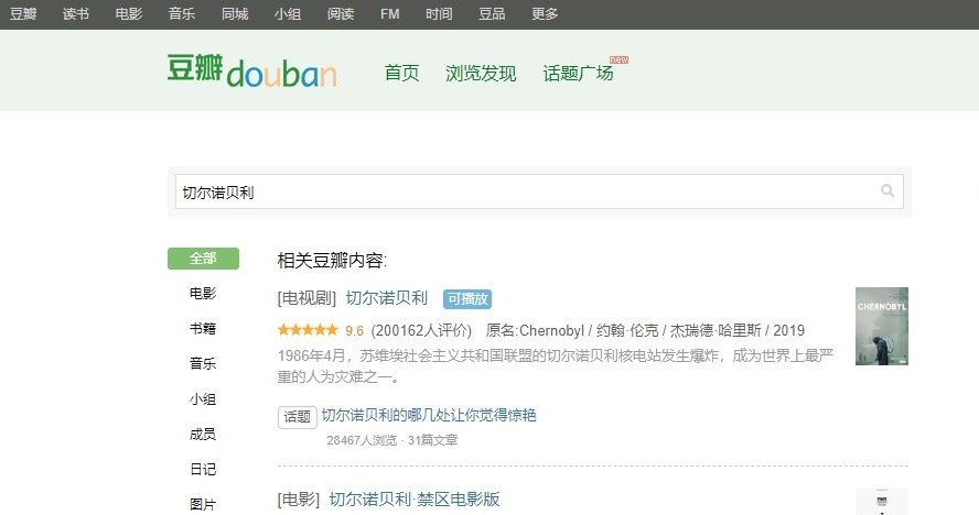 Варто відзначити, що якщо вбити "Чорнобиль" у пошуку Douban посилання на серіал з'являється. Якщо ж по ньому перейти, то з'являється порожня сторінка, а потім сервіс автоматично перенаправляє на сторінку з іншими фільмами.