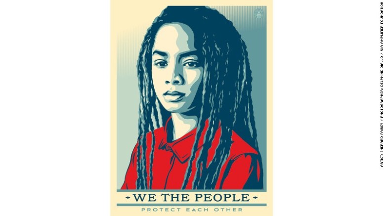 На трьох плакатах зображені мусульманська, латиноамериканська та афро-американська дівчини. Підпис на плакаті з мусульманською дівчиною в хіджабі говорить "Ми - люди - сильніші, ніж страх". На плакаті з латиноамериканською дівчиною з червоною трояндою у волоссі написано "Ми - люди. Захистити гідність". Підпис на плакаті з афро-американкою - "Ми - люди. Захищати один одного".