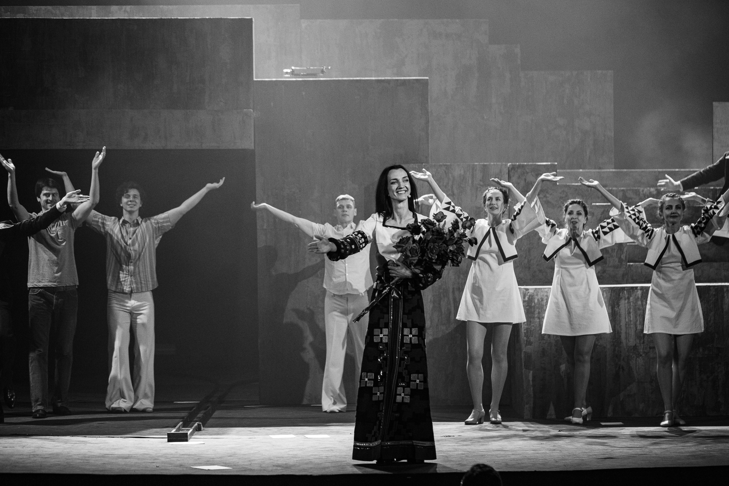 Нині технології дозволяють митцям відтворити голографічне зображення співака. Тому коли на сцені з’явилася Софія (Наталія Поліщук-Московець), стало навіть трохи моторошно. Схожість із королевою радянської естради Софією Ротару, яка стала знаменитою завдяки пісням Володимира Івасюка, вражає. Софія/Наталія до того ж є не менш голосистою, ніж її відомий прототип. Мабуть, щоб не злякалися цієї «ідентичності» (переконалися, що це жива людина) й точно впізнали любов до збирання квітів, режисер відправляє Софію «з концертом» до глядацької зали. Тут вистава любителів «хуторянки» розчарує. Образ культової співачки та її продюсера-чоловіка — це негативні персонажі, хитрі й корисливі зрадники відкритого у своїй беззахисній любові до них Володимира.