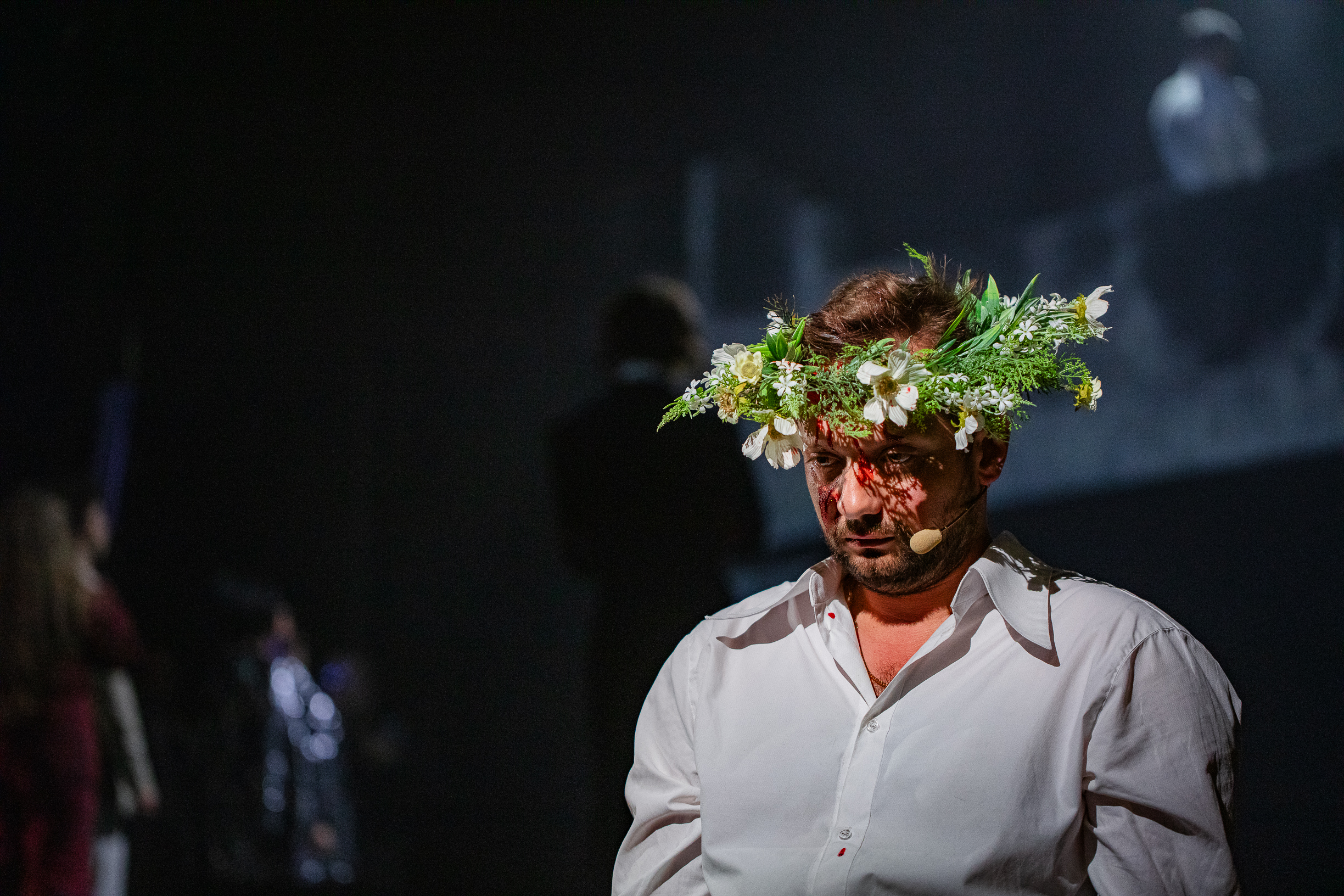 Терновий вінок Володимира Івасюка, в якому Марка Дробота «виводить» до глядацької зали режисер, прикрашений мальвами. Квіти зацвітають «кров’ю», яка стікає по обличчю актора, коли він виконує баладу. На тлі сірого моноліту виникають слова матері Володимира: «Як ти хочеш святкувати 30-річчя?». «Скромно, мамочко», — безвимовними словами проєкції відповідає син.