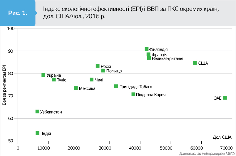 Показовий зв'язок між індексом і ВВП на одного жителя країни. Як бачимо, екологічна ефективність залежить від рівня ВВП (рис. 1). У верхньому правому куті концентруються країни з високими показниками, в нижньому лівому - з низькими. Позиції України, звісно, можуть бути й вищими, однак поточні внутрішні причини, воєнні дії знижують наявний потенціал.