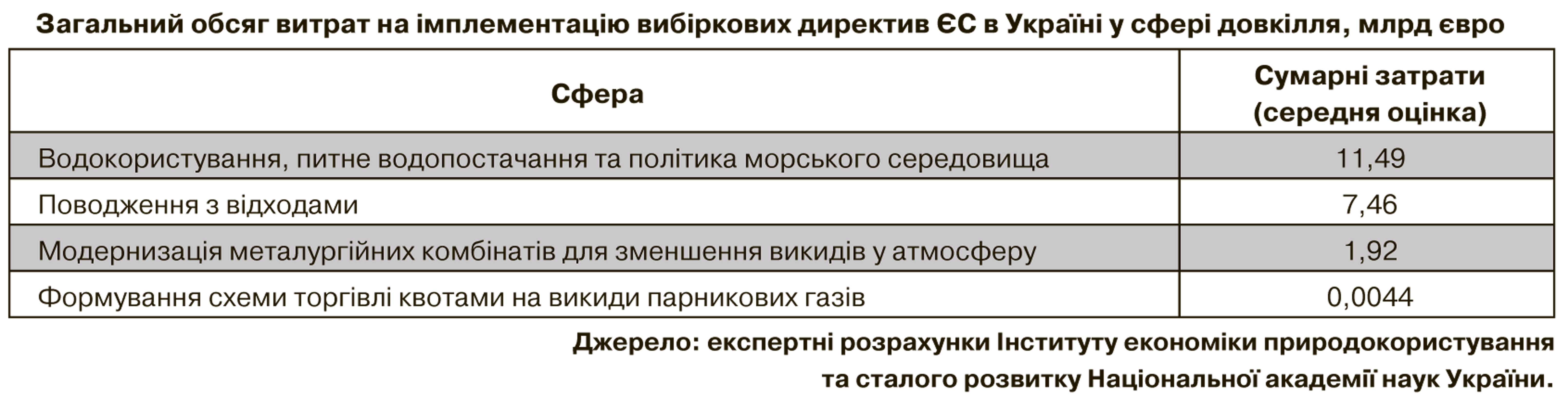 У контексті євроінтеграції існують розрахунки необхідних фінансових ресурсів для впровадження стандартів Євросоюзу по окремих екологічних директивах (див. табл. на сайті DT.UA) Як видно, показники значні, але імплементація цих директив дозволить істотно поліпшити екологічну ситуацію в Україні.