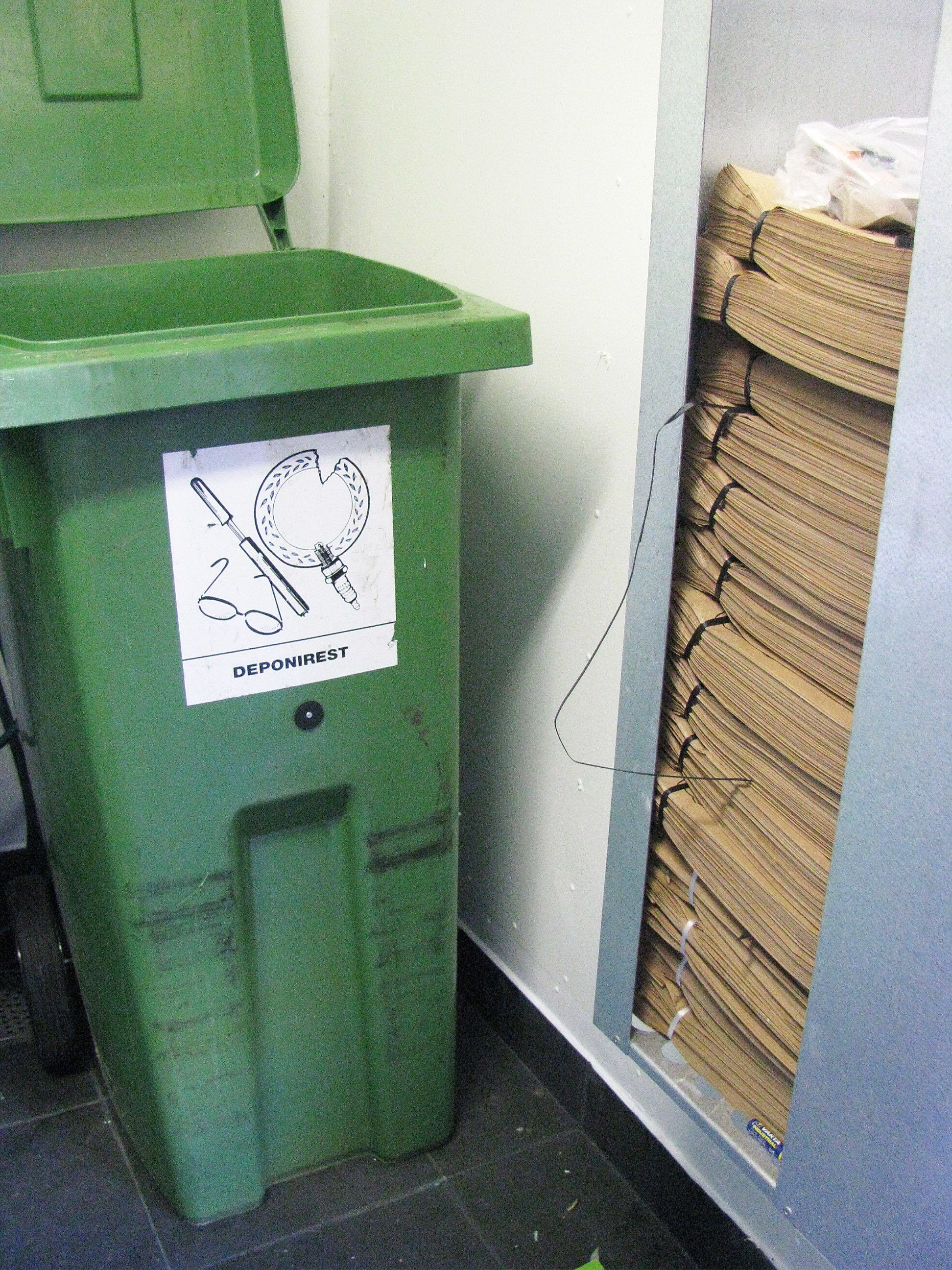 У багатоквартирних будинках на першому поверсі, поруч зі спільною пральнею, є приміщення для збору сміття (вхід у нього обов'язково окремий, знадвору). Поруч із кількома контейнерами для різних відходів - гірка вже знайомих нам паперових пакетів, яка весь час поповнюється.