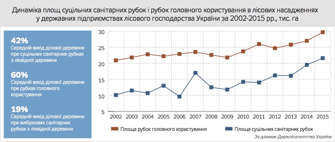 У наведених даних особливо вражають два показники: 1) більше ніж удвічі за останні 13 років збільшилися площі суцільних санітарних рубок лісу; 2) надзвичайно низький відсоток виходу ділової деревини при вибіркових санітарних рубках (19%). А загалом Україна за середнім показником щорічно вилученої деревини з гектара посідає останнє місце в Європі - 57м3/га. Польща - 77,4м3/га (дані академіка О.Фурдичка). Єдине, до чого останні "міністри" додумалися, "реформуючи" лісову галузь, - максимально скоротити кількість лісників, довівши обслуговувану ними площу лісу до 1000 га і більше. Мій батько-лісник голодного 1947 р. обслуговував лише 400 га, і ліс у нього не всихав. Останнім часом над головами лісівників дамокловим мечем висять реформа, приватизація, конкурс-профанація. Про неприпустимість повальної приватизації державних підприємств лісового господарства багато говорити не треба: у результаті будуть "прихватизовані" найкращі з них, в яких іще є ліс. "Це не що інше, як один з чергових етапів руйнування лісової галузі напередодні її подальшої приватизації" (Павло Кравець, DТ.UA від 30.01.2016). Що ж до конкурсів на посаду директорів лісгоспів, то вони нагадують відомі в минулому "особливі трійки НКВС".Лісівники від усього цього вже просто втомилися! Скільки їх - патріотів-романтиків, талановитих випускників з лісогосподарською спеціальністю, так і не змогли знайти застосування своїм знанням у профільній галузі!