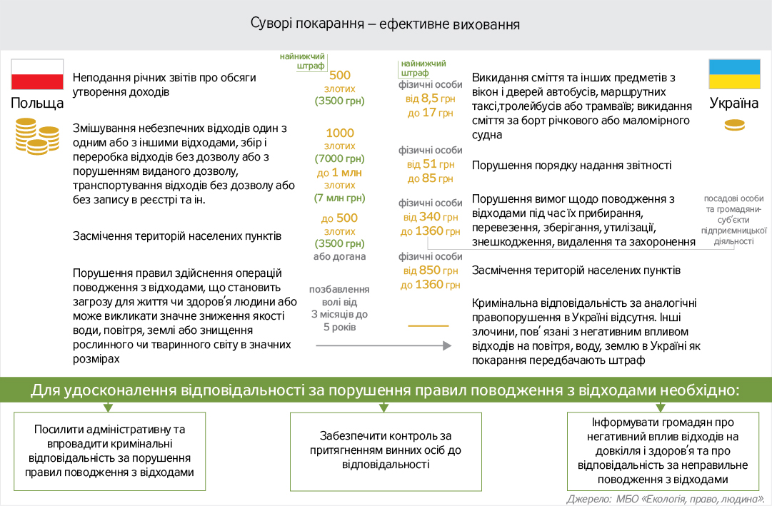 На противагу Україні, наприклад, у Польщі штрафи за недотримання законодавства про відходи є значно вищими. Так, за засмічення територій населених пунктів встановлюється покарання у вигляді штрафу в розмірі до 500 злотих (3500 грн) або догани; за неподання річних звітів про обсяги утворення відходів штраф становить 500 злотих (3500 грн), а змішування небезпечних відходів один з одним або з іншими відходами, збирання і переробка відходів без дозволу або з порушенням виданого дозволу, транспортування відходів без дозволу карається штрафом у розмірі від 1000 злотих (7000 грн) до 1 000 000 злотих (7 000 000 грн).