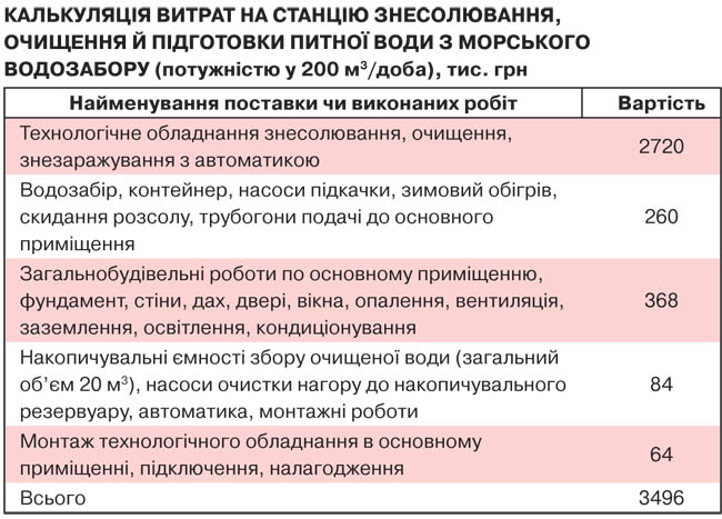 Додам, що якість морської води після опріснення ще й мають контролювати санепідстанції, щоб вода за своїми параметрами відповідала російським СанПіН 2.1.4.1074-01 або українським CанПіН 2.2.4-171-10. Собівартість такої води складається з витрат на електроенергію, замінні матеріали, сервісне обслуговування, амортизацію обладнання й становитиме для систем підготовки води з засолених свердловин близько 9 рос. руб. за м3, з морського ж водозабору - 34 рос. руб. за м3.