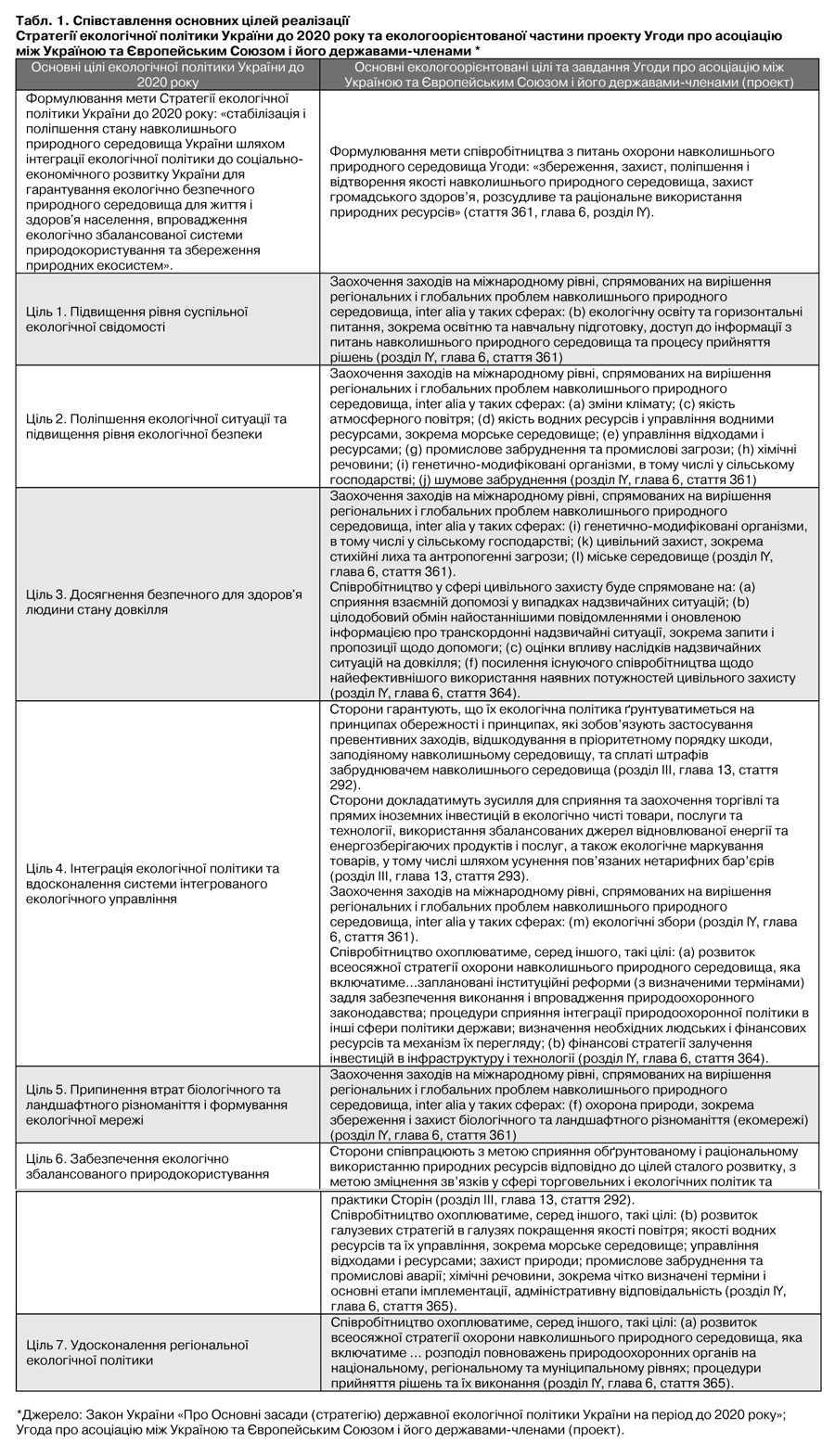 Підкреслимо, що на порядку денному розвитку й поглиблення відносин Україна - ЄС є остаточна корекція проекту новітньої Угоди про асоціацію між Україною та Європейським Союзом і його державами-членами, її підписання. Аналітичний огляд статей і положень цієї новітньої Угоди в частині міжнародного екологічного управління, екологічної політики, інструментарію екологічного регулювання, раціонального використання природних ресурсів відповідно до цілей сталого розвитку, охорони та відтворення навколишнього природного середовища тощо дав можливість порівняти їх зі стратегічними цілями та завданнями з реалізації вітчизняної екологічної політики, визначеними Законом України "Про Основні засади (стратегію) державної екологічної політики України на період до 2020 року". Результати такого вибіркового зіставлення узагальнені в табл. 1.