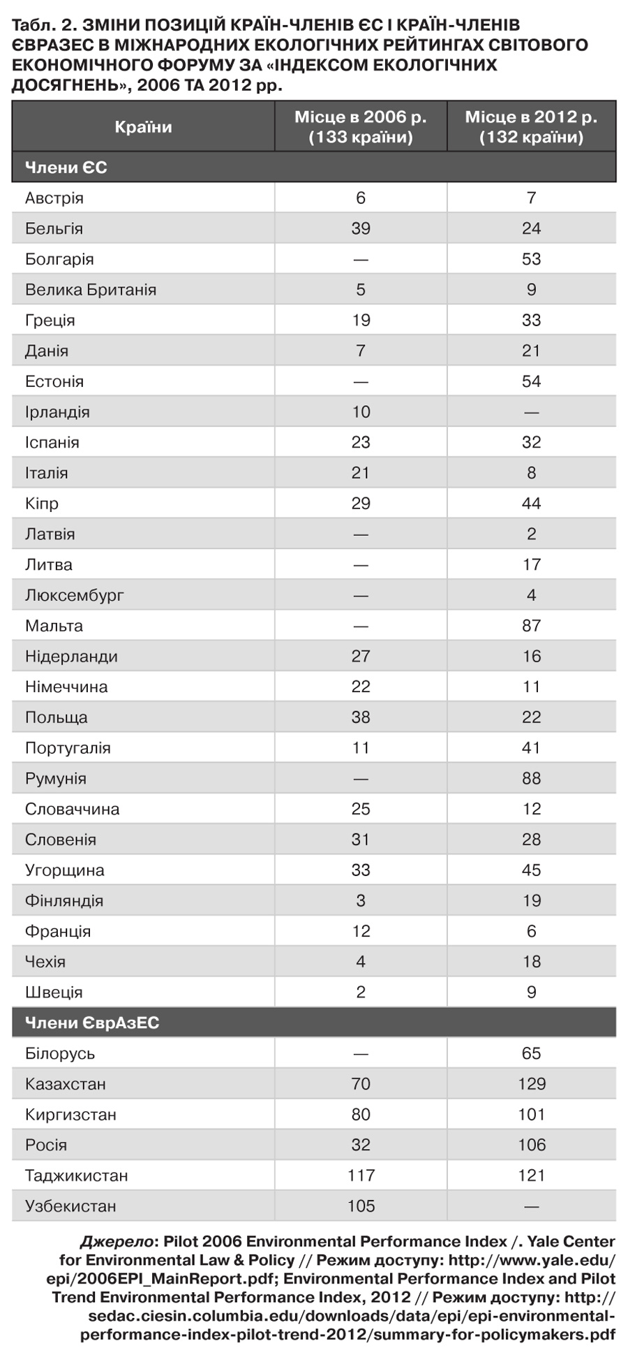 Динаміку світових позицій країн-членів ЄС і країн-членів ЄврАзЕС за рівнем екологічної сталості за останні сім років (упродовж 2006 - 2012 рр.) на сходинках всесвітнього екологічного рейтингу наведено в табл. 2.