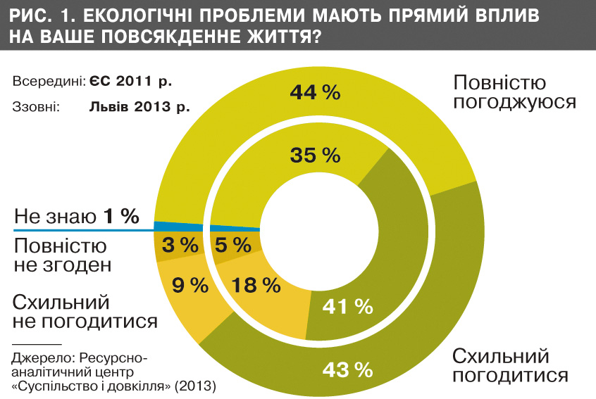 Якість життя людей визначається не лише величиною зарплати та обсягом товарів і послуг, які можна за неї придбати. Згідно з даними періодичного опитування, яке проводить Європейська Комісія, 77% європейців вважають, що стан довкілля дуже важливий для якості їхнього життя, а 76% - що екологічні проблеми безпосередньо впливають на їхній щоденний побут (Special Eurobarometer 365. Attitudes of European citizens towards the environment. 2011). В Україні таке опитування проводилося лише на пілотному рівні у м. Львові, проте дані свідчать про однаковість тенденцій: 87% опитаних вважають, що екологічні проблеми мають прямий вплив на їхнє повсякденне життя (див. рис. 1).