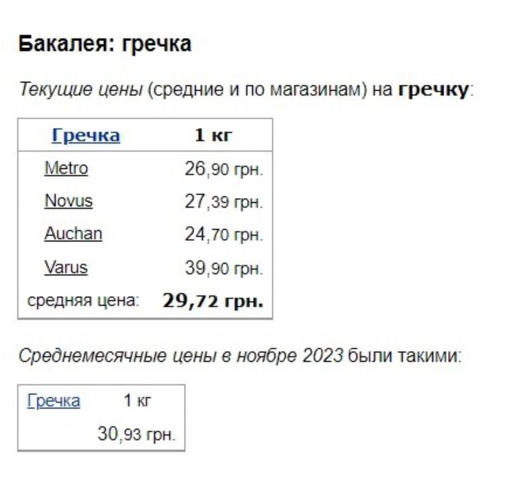 Зокрема ціни на гречку, порівняно з минулим місяцем, знизилися з 30,93 грн/кг до 29,72 грн/кг. Її вартість наразі коливається від 24,70 грн/кг (Ашан) до 39,90 грн/кг (Варус).