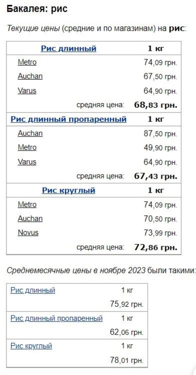 Довгий рис знизився у ціні з 75,92 грн/кг до 68,83 грн/кг. Круглий рис подешевшав із 78,01 грн/кг до 72,86 грн/кг. Пропарений довгий рис, навпаки, зріс у ціні 62,06 грн/кг до 67,43 грн/кг.