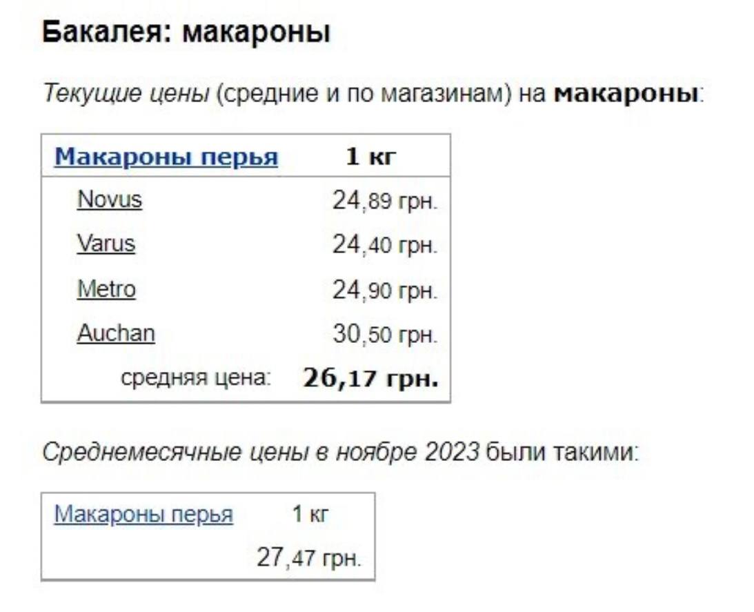 А ось макарони пір'я продаються по 26,17 грн/кг, що дешевше, ніж минулого місяця – 27,47 грн/кг.