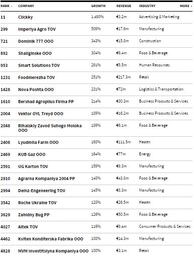 Інші українські компанії задіяні в агросекторі, медичній сфері, логістиці й транспорті. У двадцятку швидкозростаючих підприємств включили "Нову пошту", "Рош Україна" і "Фудмережу", до якої належать продуктові крамниці "Велика кишеня".