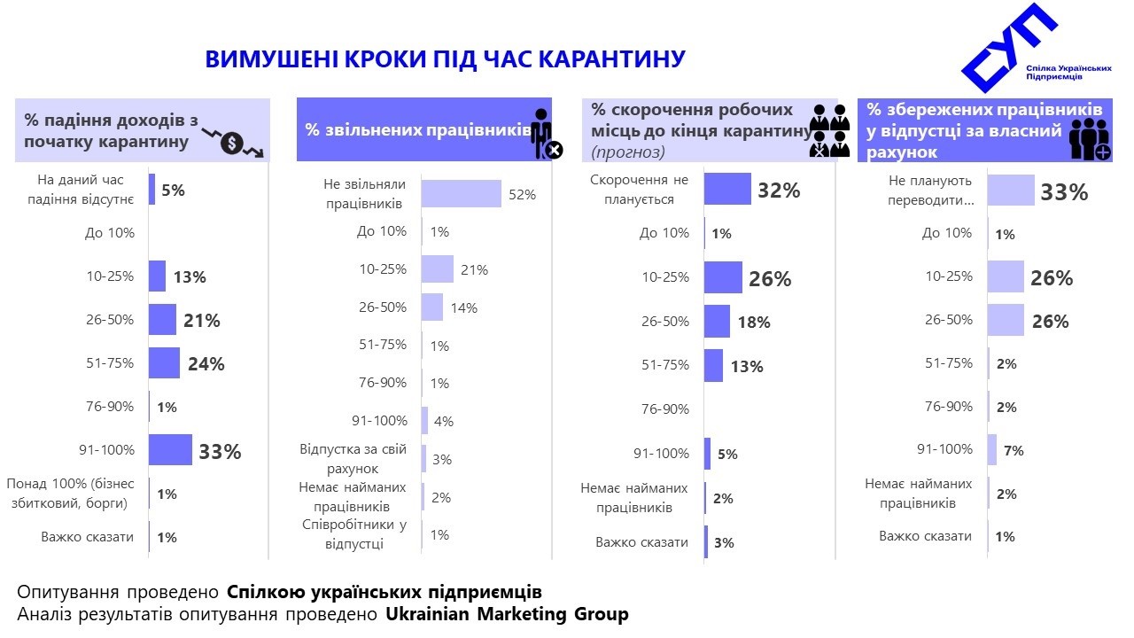 Третина власників бізнесу (переважно мікро-), заявляють про падіння доходів на 90-100% з початку карантину. Ці ж підприємці вже звільнили до 50% штату співробітників.