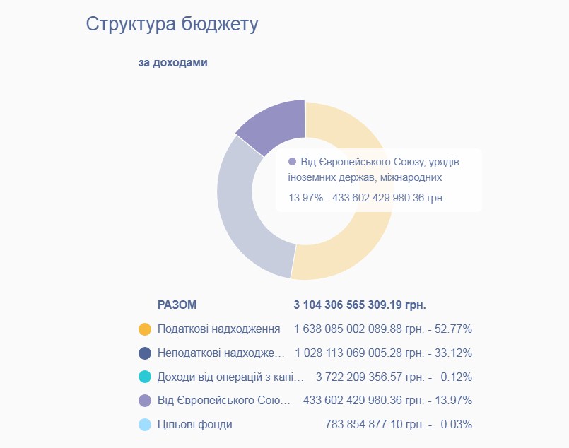 За показниками зведеного державного і місцевих бюджетів України, головний кошторис країни на 14% фінансується завдяки грантам - отриманим від зовнішніх організацій, коштам, повідомляє Державний веб-портал бюджету для громадян.