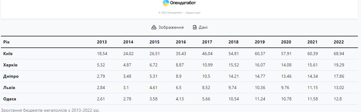 Протягом 7 років з моменту старту в Україні реформи децентралізації бюджети великих міст України зросли від 3,5 до майже 6,5 разів. Про це повідомляє платформа для роботи з відкритими даними Опендатабот.