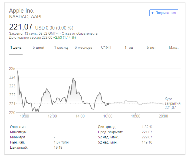 Якщо напередодні акції Apple демонстрували зростання з 218 до 223 доларів, то сьогодні ціна однієї акції знизилася до 221 долара.