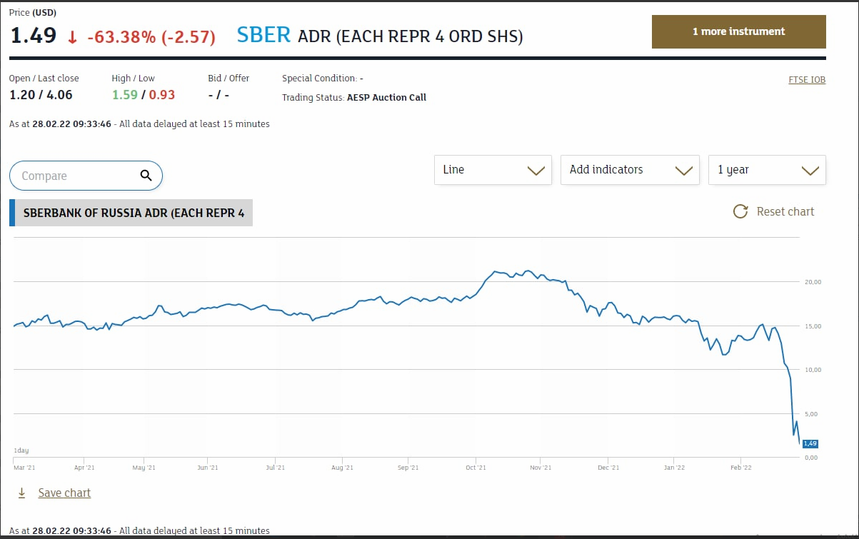 Папери російського Сбєрбанку на лондонській біржі впали на 63,38%, до $1,49. Про це свідчать дані торгів на біржі станом на 9:30, 28 лютого.