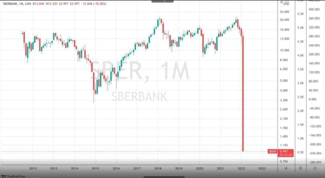 До полудня акції російського Сбєрбанку зажурилися ще більше, та обвалилися на катастрофічні 92,8%.