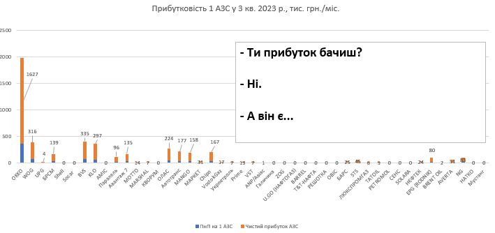 У ІІІ кварталі 2023 року 34 з 48 мереж показали нульовий або мінімальний прибуток до 1 млн грн. Серед них такі відомі мережі як Socar, Shell, UPG, U.GO (НАК «Нафтогаз»), Motto.