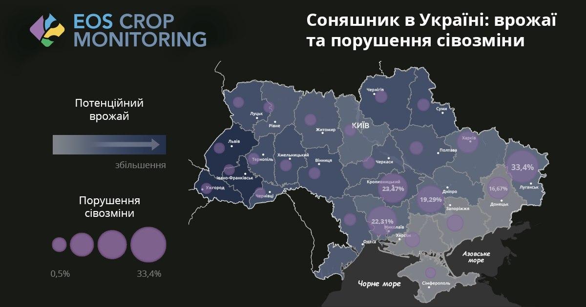 Аналіз сільськогосподарської платформи EOS Crop Monitoring показав, що значний відсоток с/г земель в Україні обробляється всупереч принципам сівозміни. Особливо це стосується культур на кшталт соняшника, які сильно виснажують землю.