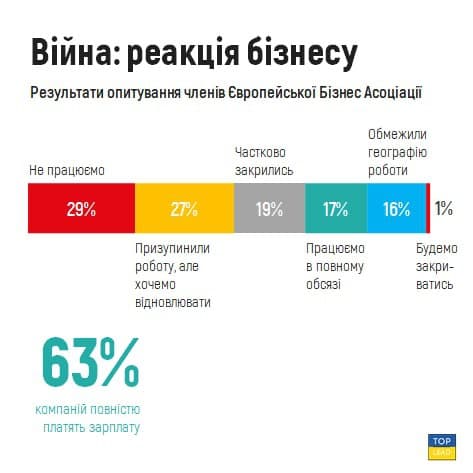Близько 29% українських компаній на даний час не працюють, 63% виплачують заробітну плату у повному обсязі. Про це свідчить опитування членів Європейської бізнес асоціації.