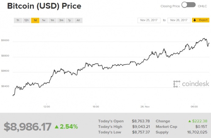 Курс Bitcoin у неділю, 26 листопада, вперше досяг позначки у $ 9, свідчать дані CoinDesk.