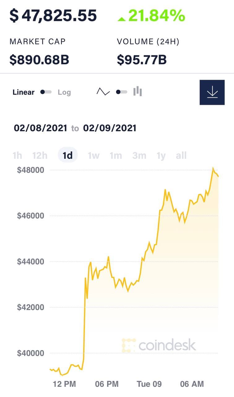 Біткоін продовжує зростати другий день поспіль на тлі новин про вливання компанії Tesla в криптовалюту 1,5 млрд доларів. За цей час він уже перевищував 48 тисяч доларів, на ранок 9 лютого його ціна коливається в районі 47,7 тисяч доларів.