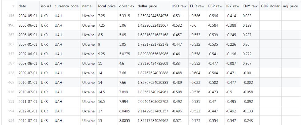 Редакція DT.UA зібрала дані індексу "Біг Маку" щодо української гривні з моменту потрапляння валюти до цього рейтингу – у 2004 році. Вперше індекс "Біг Мака" опублікували в 1986 році.