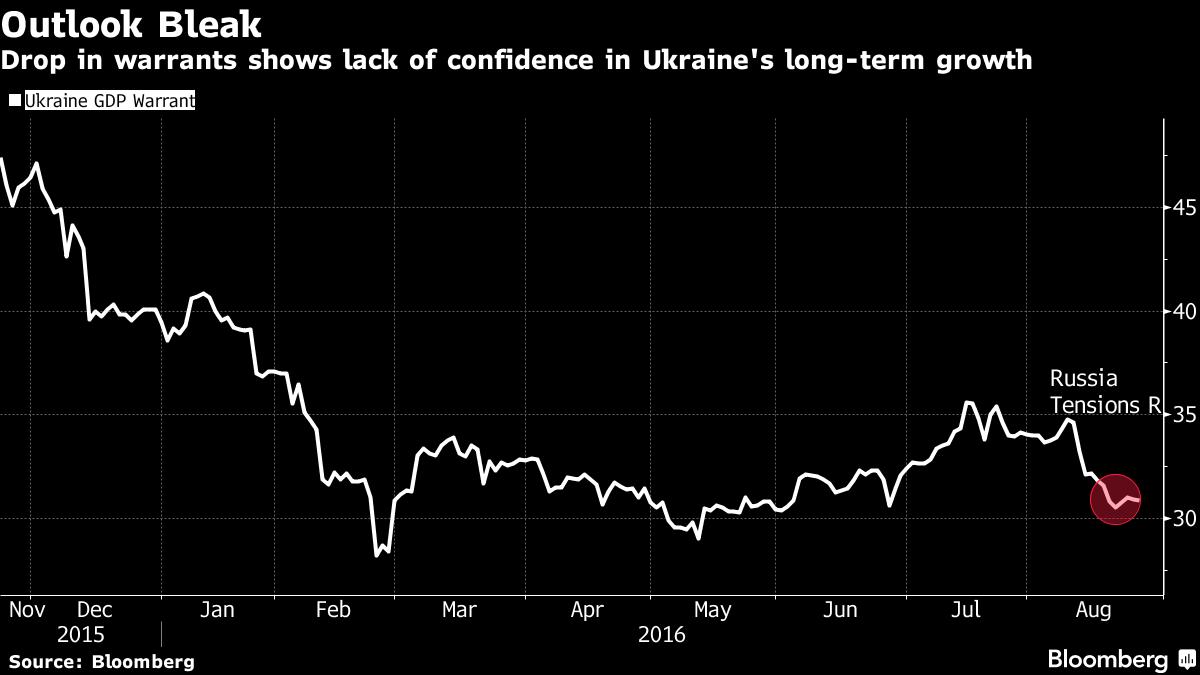 Загострення відносин між Україною і Росією, а також ескалація більш ніж дворічного конфлікту на сході України погіршили перспективи зростання української економіки. Так звані ВВП-варанти, випущені в рамках реструктуризації і які передбачають виплати в разі, якщо валовий внутрішній продукт перевищить $ 125 млрд, цього року подешевшали на 20% на тлі погіршення перспектив відновлення.