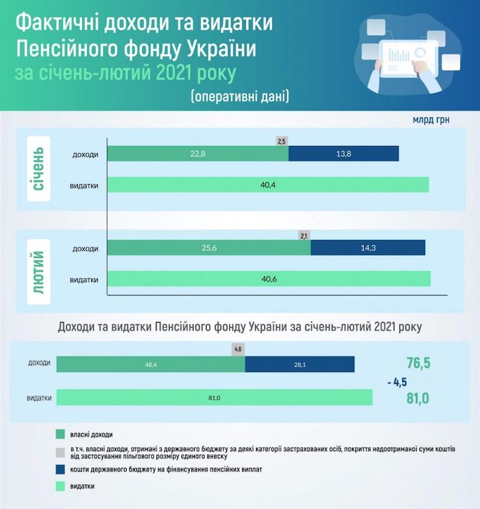 В цілому Фонд збільшив надходження за січень-лютий 2021 року на 6,5 млрд грн проти відповідного періоду 2020 року до 76,5 млрд грн. Витрати фонду склали 40,6 млрд грн в лютому і 81 млрд грн від початку 2021 року.