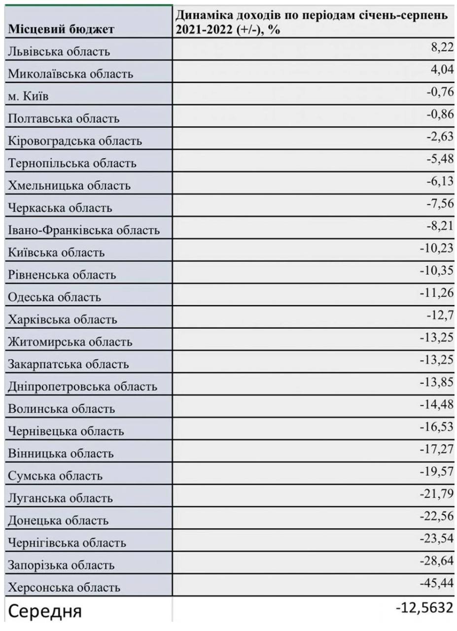 Однак, при цьому є дві області, бюджети яких зросли: Львівська (+8,2%); Миколаївська область (+4,04%).