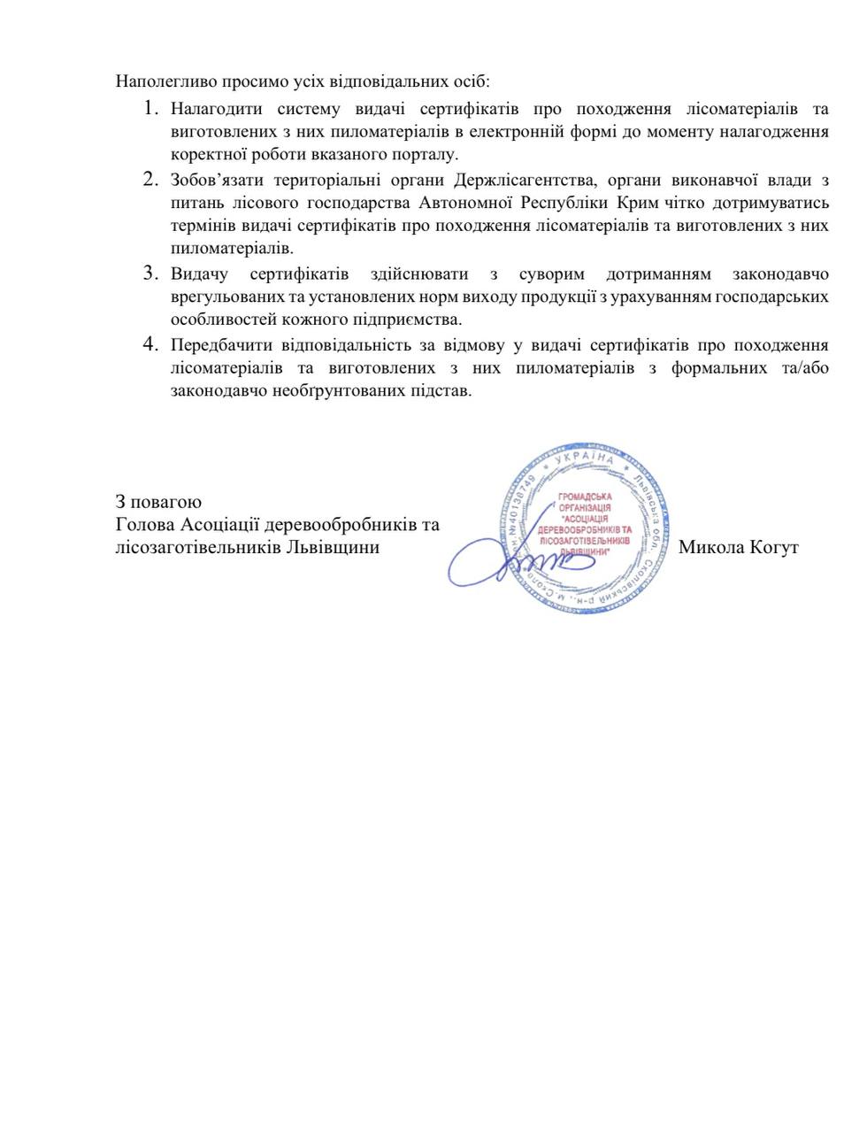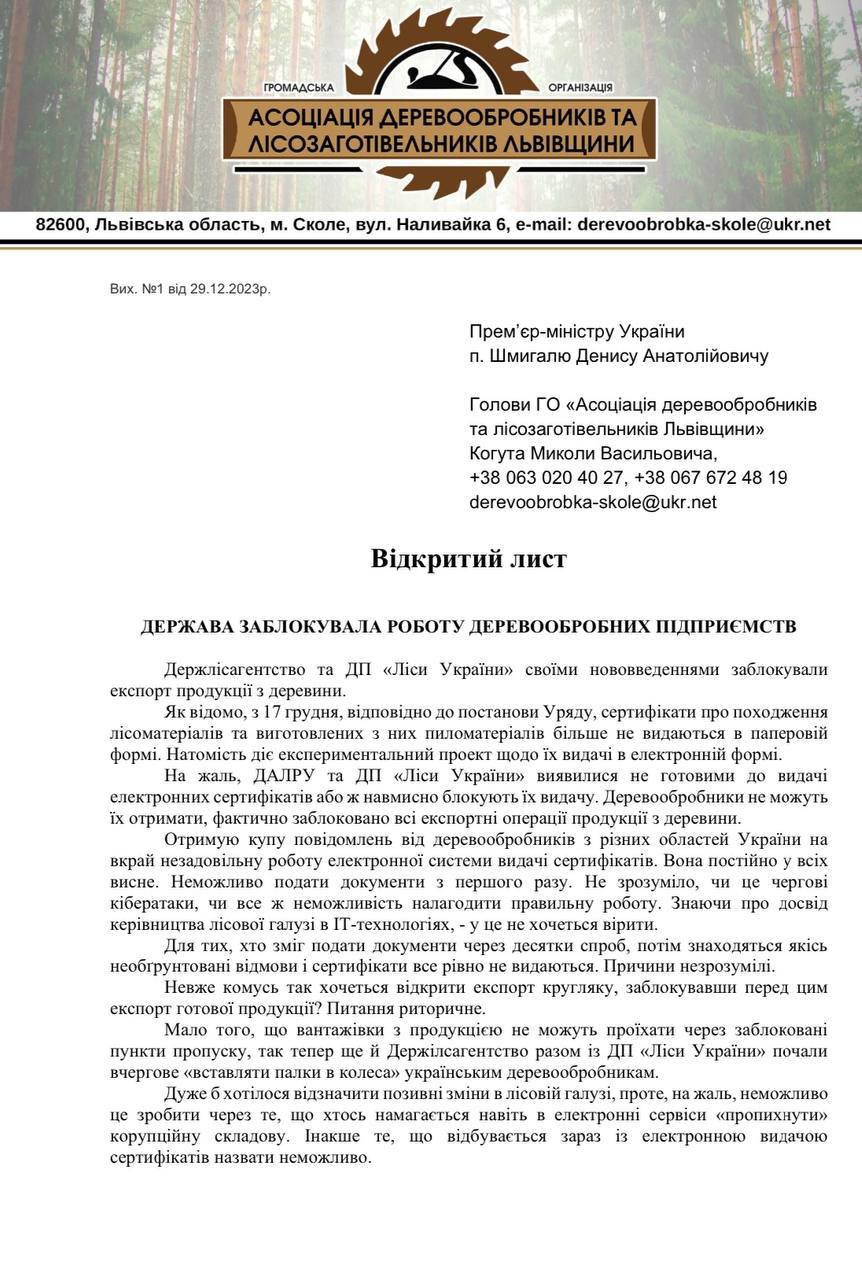 «Фактично заблоковані всі експортні операції, що призводить до великих фінансових і репутаційних втрат, наче хтось поставив за мету остаточно добити деревопереробний сектор нашої держави, щоб зняти мораторій на вивіз необробленої деревини і експортувати її замість готової продукції», – зазначає голова Асоціації деревопереробників та заготівельників Львівщини Микола Когут.