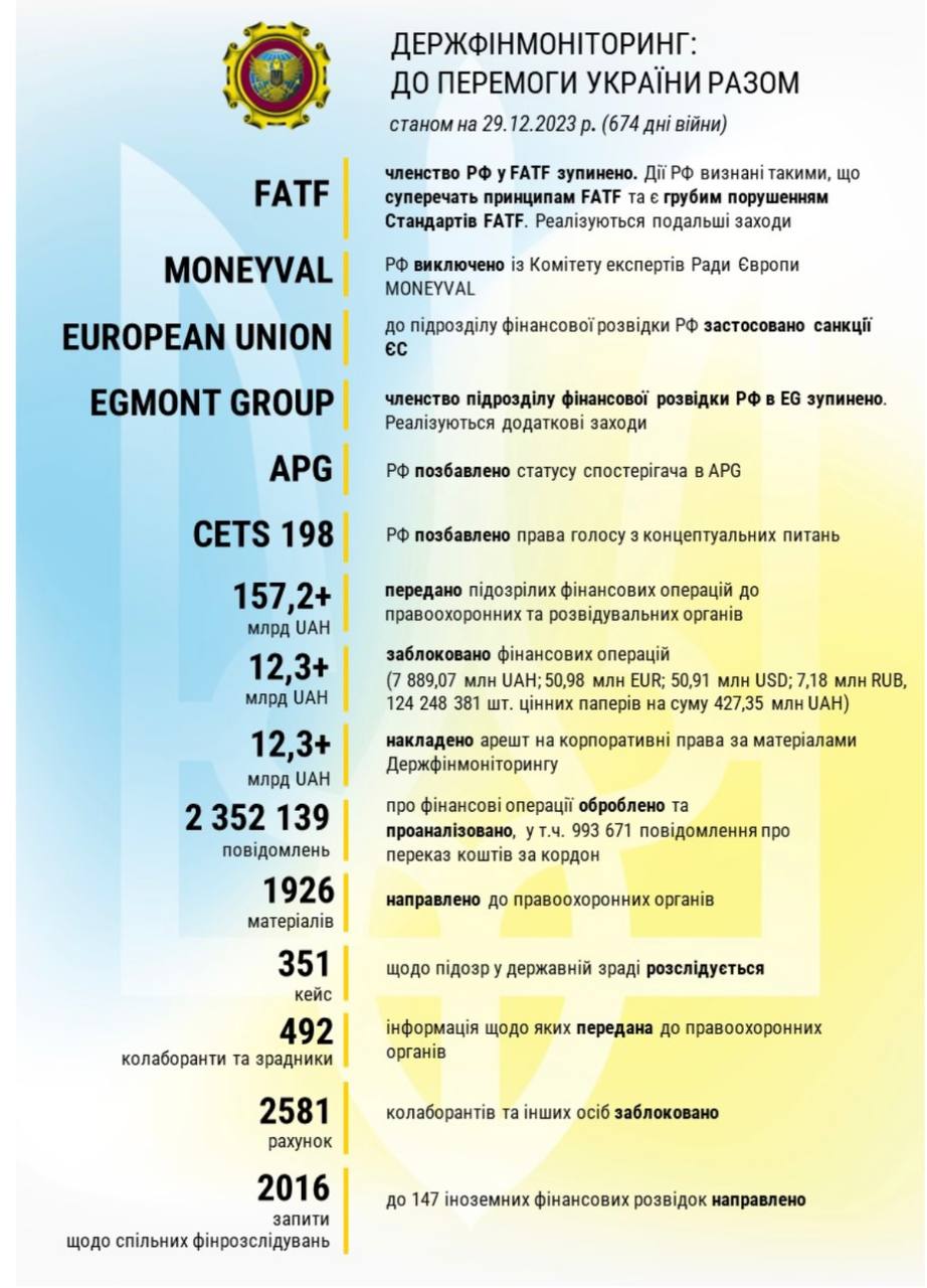 Особливим досягненням у Держфінмоніторингу вважають свою протидію військовій агресії РФ проти України. Зокрема було припинено членство Росії у FATF, Росію виключено із Комітету експортерів Ради Європи MONEYVAL, зупинено членство підрозділу фінансової розвідки РФ в EG. Крім іншого, було заблоковано 2581 рахунки колаборантів та інших підозрілих осіб.