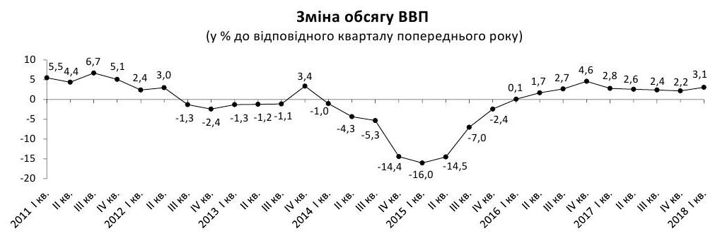 Державна служба статистики підтвердила попередню оцінку, згідно з якою зростання валового внутрішнього продукту (ВВП) України в січні-березні 2018 року склало 3,1% до аналогічного періоду 2017 року.