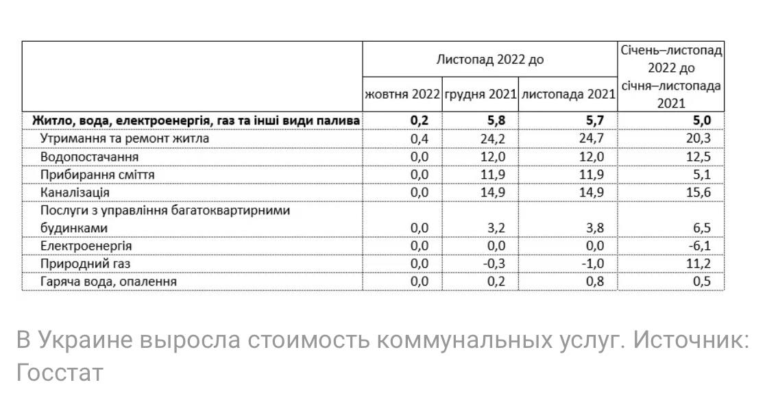 Порівняно ж із жовтнем-2022, вартість комуналки змінилася не так кардинально – на 0,2%. Подорожчала лише одна позиція – утримання та ремонт житла, на 0,4%. Журналісти obozrevatel.com звели дані до однієї таблиці: