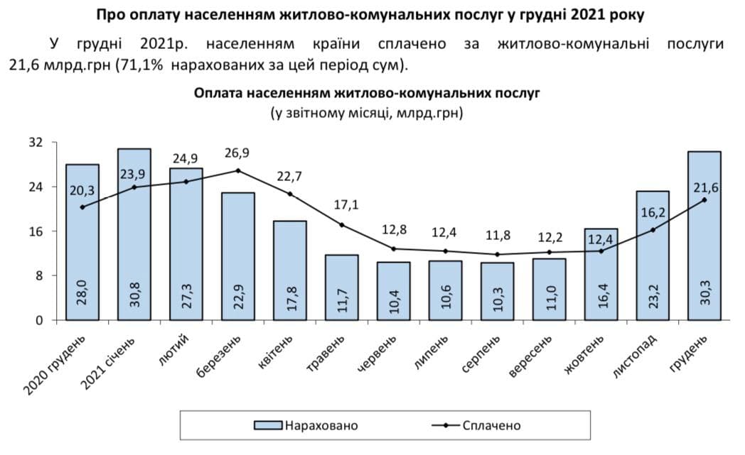 За даними відомства, на кінець грудня населення сплатило 71,7% від нарахованих сум у квитанціях, а саме 21,6 млрд із 30,3 млрд. Для порівняння, на кінець грудня 2020 року було сплачено 20,3 млрд із 28 млрд. При цьому за рік суми в платіжках зросли на 2,3 мільярда, у несплата - зросла на 1,3 млрд.