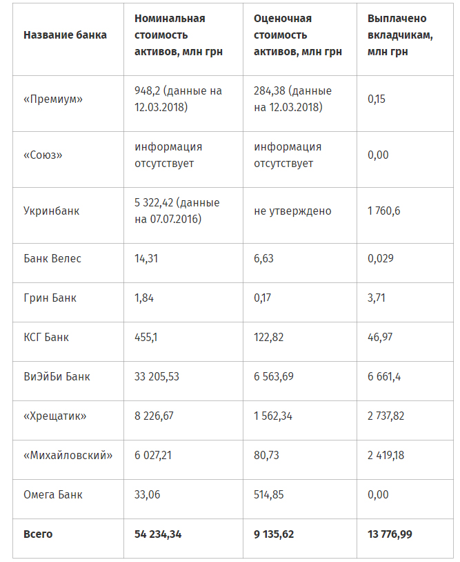 Номінальна вартість активів цих банків становить 54,23 млрд грн, в той час як їх оціночна вартість в шість разів нижче - 9,14 млрд грн.