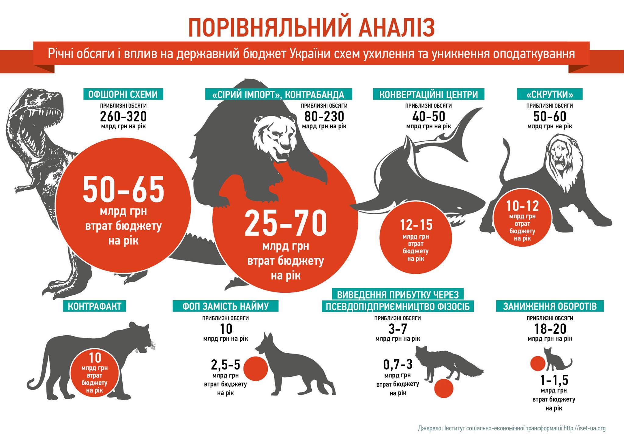 Учасники форуму назвали способи "вирощування" тіні в Україні: переміщення прибутку до "податкових гаваней" ("офшорів"), контрабанда (маніпуляції з митною вартістю товарів, перерваний транзит, зловживання правом безмитного пересилання та провезення товарів, відсутність контролю ланцюжка продажу імпортних товарів), розкрадання ПДВ, зловживання спрощеною системою оподаткування з боку крупного бізнесу. Обсяг офшорних схем в Україні становить 260-320 млрд грн на рік, втрати бюджету від них – 50-65 млрд грн. А обсяг тіні в частині порушення митних правил та контрабанди сягає 80-230 млрд грн./рік, від чого бюджет втрачає 25-70 млрд грн.