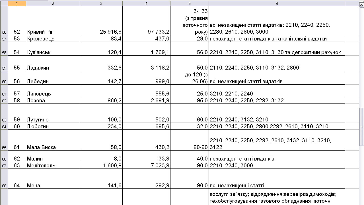 Серед міст обласного та районного значення одним із "рекордсменів" за заблокованими Держказначейством коштами є Кривий Ріг (93,7 млн грн), Дніпродзержинськ (25,5 млн грн), Енергодар (15,9 млн грн), Дрогобич (14,3 млн грн), Нікополь (13,6 млн грн), Севєродонецьк (11,6 млн грн), Ровеньки (9,9 млн грн), Ялта (8,5 млн грн), Бердянськ (7,23 млн грн.), Біла Церква (7,2 млн грн) (докладніше і про інші населені пункти - див. табл. 2).